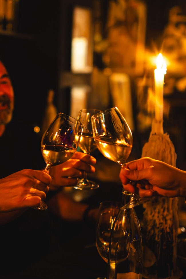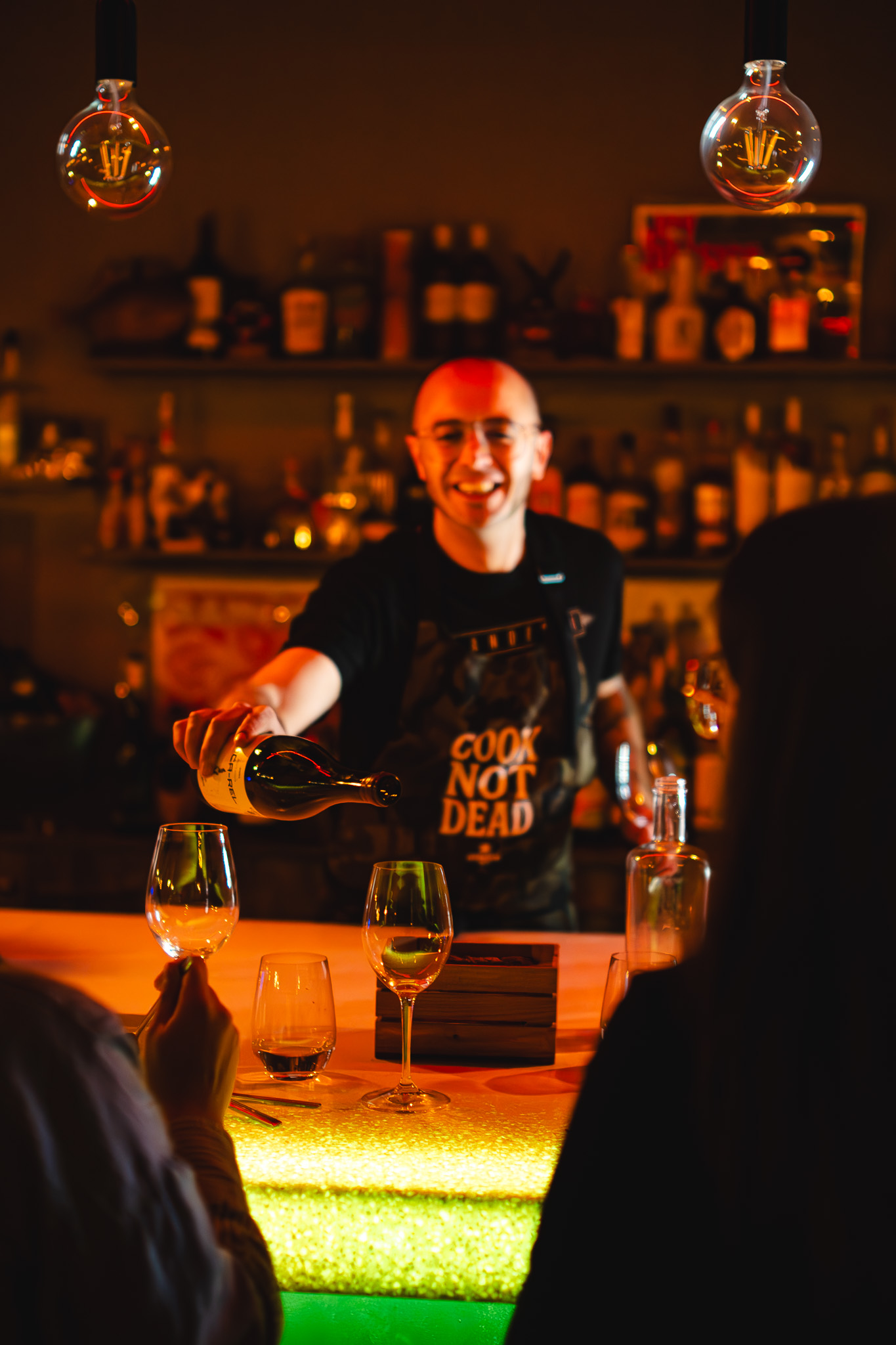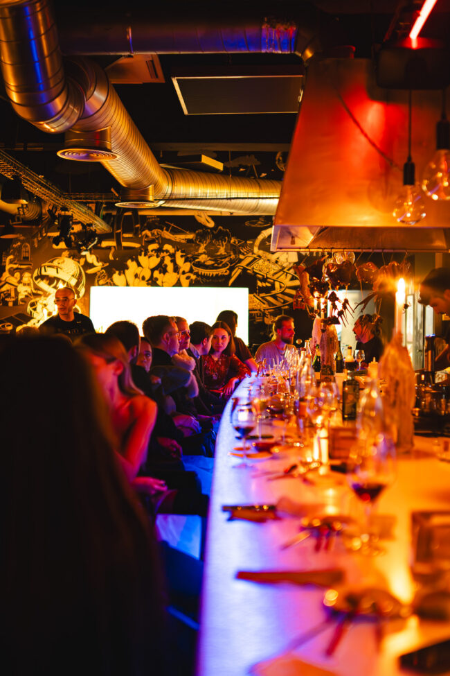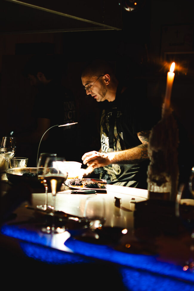 La música es ingrediente en un entorno íntimo y oscuro que busca dejar el mundo atrás, jugando con todos los sentidos. Una barra de Krion que cambia de color según evoluciona la noche.