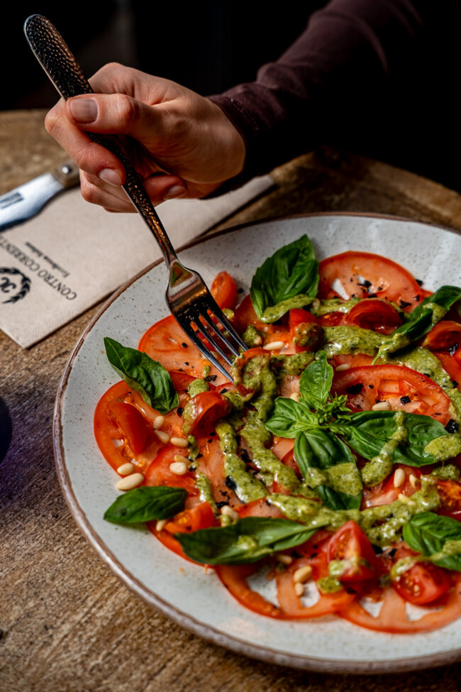 - Carpaccio de tomate con pesto de albahaca y pan a las hierbas