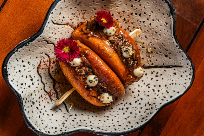Dúo de baos crujientes de lechona mallorquina en miel cruda de Mallorca y
