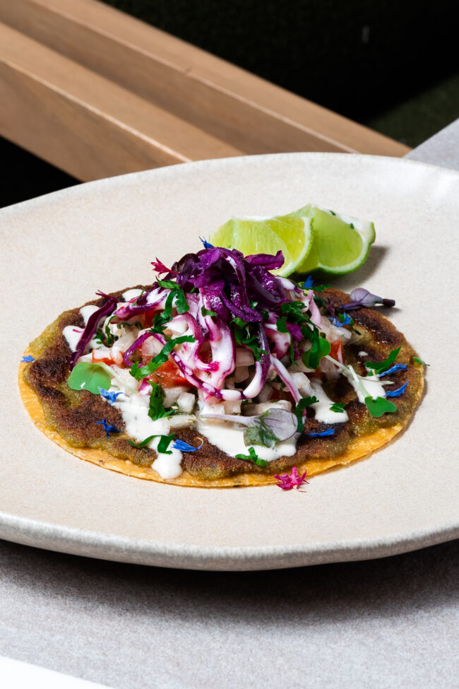 Se acompaña de un aterciopelado hummus de maíz dulce con un toque de chile y nuestras clásicas patatas fritas.