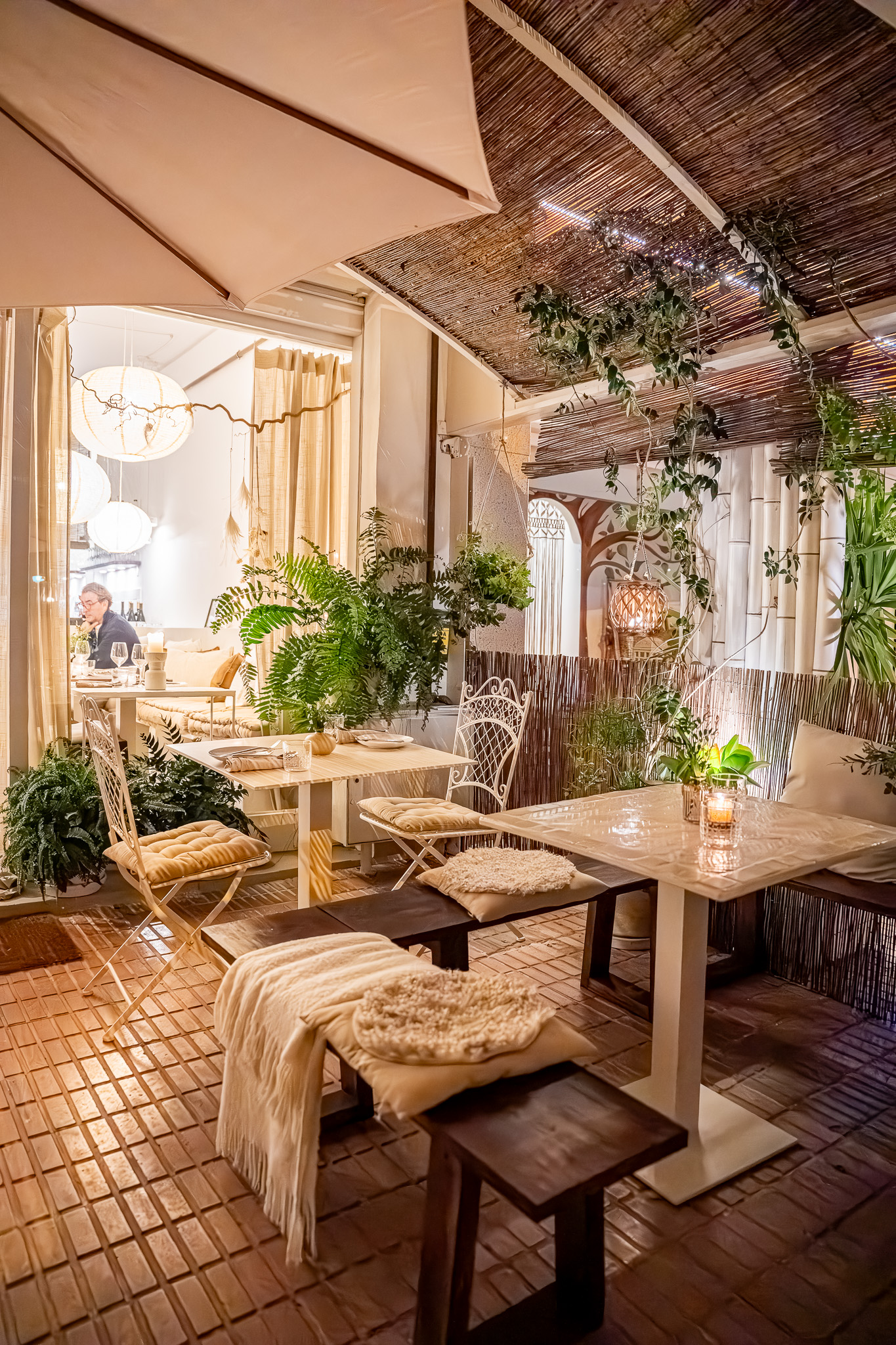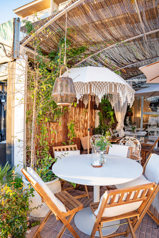 La terraza, con sus numerosas plantas, luces y velas, invita a un almuerzo o cena relajados.