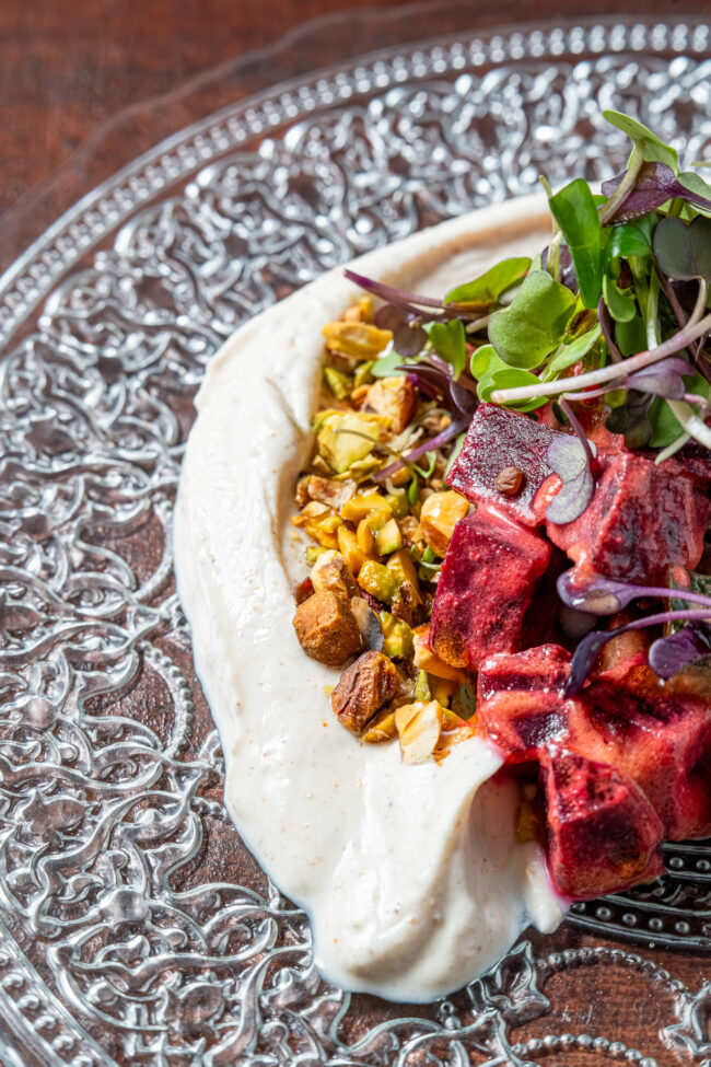 Coconut marinated Beetroot and Cucumber Salad on oriental spice flavoured whipped Cheese with toasted Pistachios and charred Naan Bread.