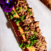 Con puré de boniato, cebolla roja encurtida, fideos de arroz crujientes y cebollino fresco.