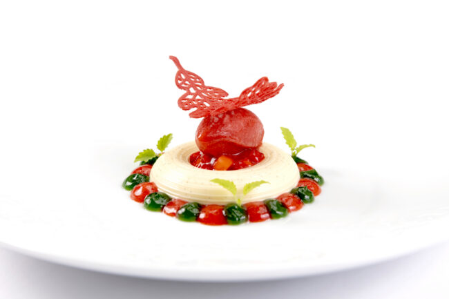 Consomé frío de tomates ahumados y albahaca con atún marinado,